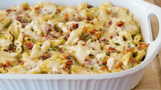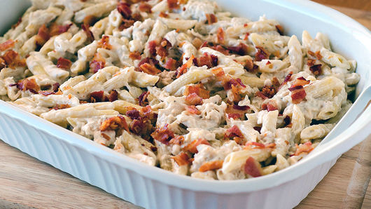 6.Add pasta to the prepared baking dish and layer with chicken and alfredo sauce; sprinkle with cheeses and bacon. Place into oven and bake until bubbly and heated through, about 15-20 minutes.
