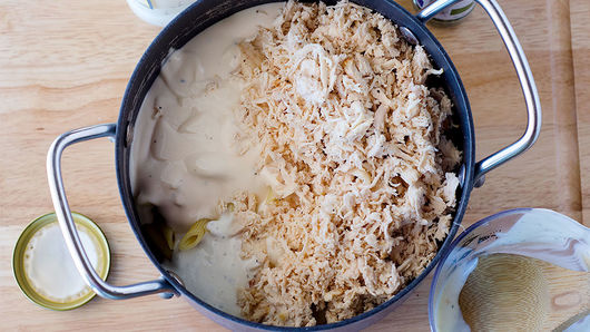 This recipe call for 4 cups of rotisserie chicken, which is about how much chicken can be pulled from a standard deli-roasted bird. If your family prefers all white meat, get two rotisserie chickens, use leftover cooked chicken, or saute 4 cups chopped boneless-skinless chicken breast in olive oil until cooked through, 8 to 10 minutes.