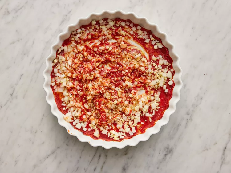 Spread tomato paste onto the bottom of a 10-inch square baking dish. Sprinkle with onion and garlic. Stir in water and 1 tablespoon olive oil until thoroughly combined. Season with salt and pepper.