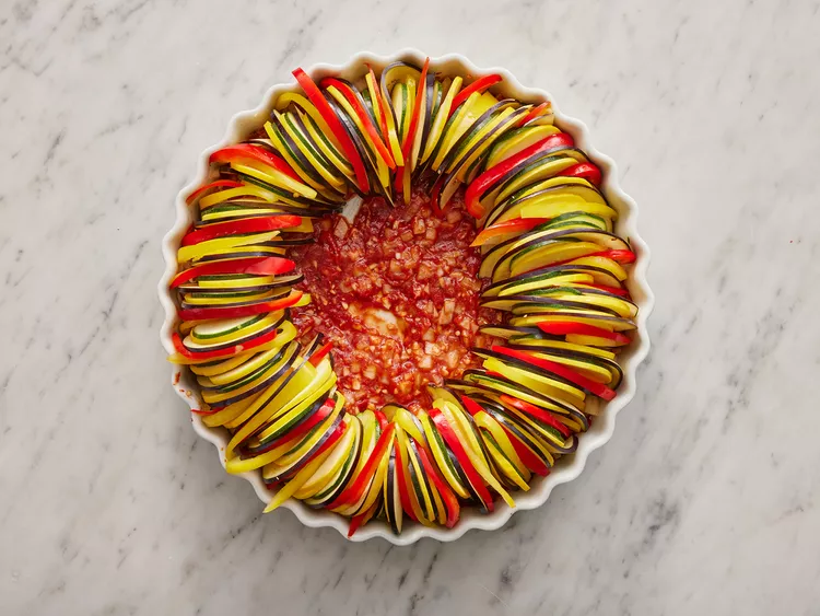 Arrange alternating slices of eggplant, zucchini, yellow squash, red bell pepper, and yellow bell pepper, starting at the outer edge of the dish and working concentrically towards the center. Overlap slices a little to display colors.