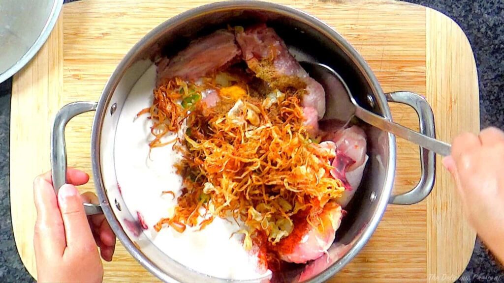 2. Chicken Marination: Combine chicken with all marinade ingredients, ⅓ fried onions and ground biryani spice blend.